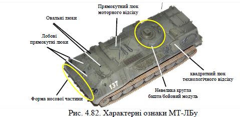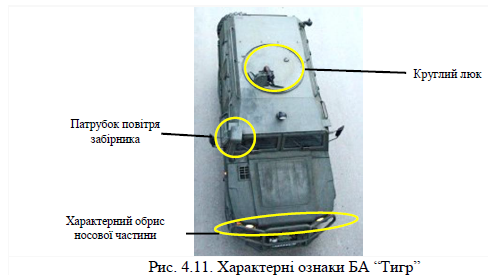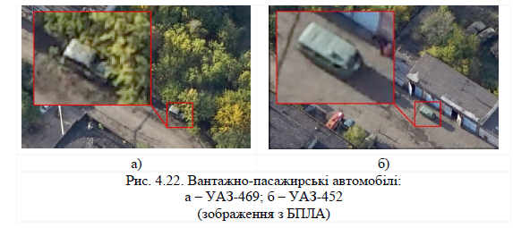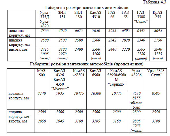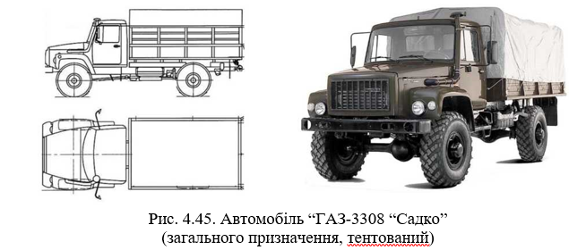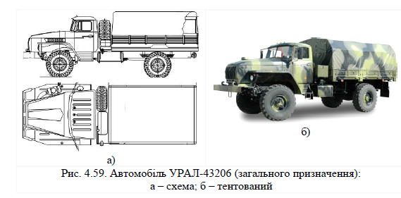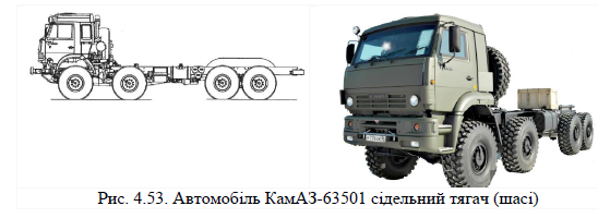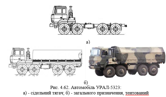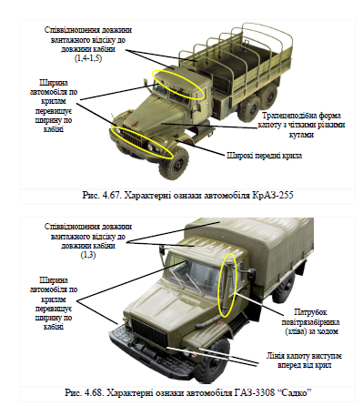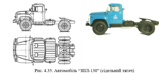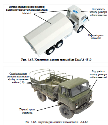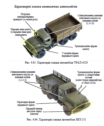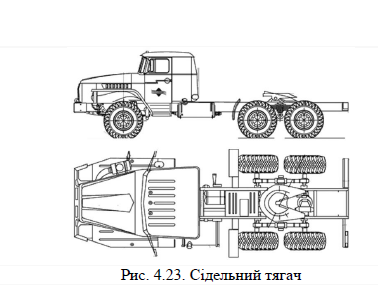 Сідельні тягачі на відміну від вантажних автомобілів загального призначення: не мають кузова, за кабіною водія розташована коротка вузька рама, в кінці якої знаходиться опорно-зчіпний пристрій, звичайно відкриті зверху задні колеса, баки для пального по боках рами та одне-два запасних колеса за кабіною водія створюють на зображенні нерівну конфігурацію та плямистий тон задньої частини тягачів, кабіна водія зверху та збоку приблизно в 3 рази ширше та вище рами автомобіля (рис. 4.23).