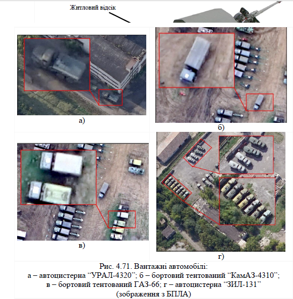 заправлення паливом різних транспортних засобів. Основною відмінною ознакою автомобілів цистерн є наявність за кабіною водія резервуара круглого або еліптичного перетину, який створює специфічний розподіл тонів зображення назнімку. Звичайно він розташовується горизонтально або під нахилом. Рідше зустрічаються вертикально розташовані циліндричні, шарові, напівсферичні або прямокутні резервуари.