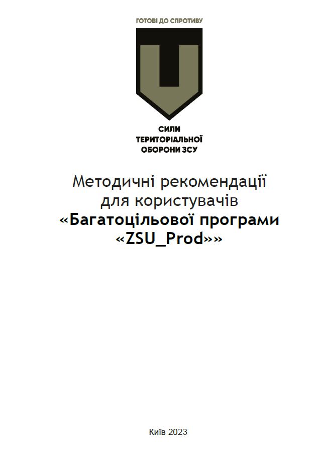 | 1 | Методичка-прод | Методичні рекомендації для користувачів «Багатоцільової програми «ZSU_Prod»», що містять покрокові інструкції для виконання основних процесів, які виконуються у продовольчій службі окремого батальйону Сил ТрО ЗСУ |