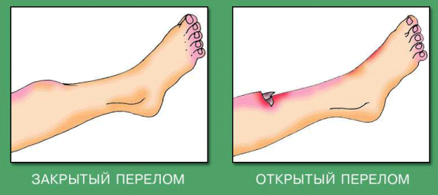 Переломи бувають закритими і відкритими (рис. 1). При закритих переломах не порушується цілісність шкірного покриву, при відкритих – у місцях перелому залишається рана. Найнебезпечніші відкриті переломи.