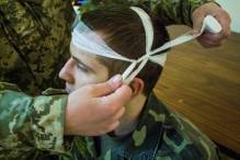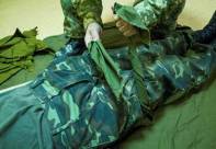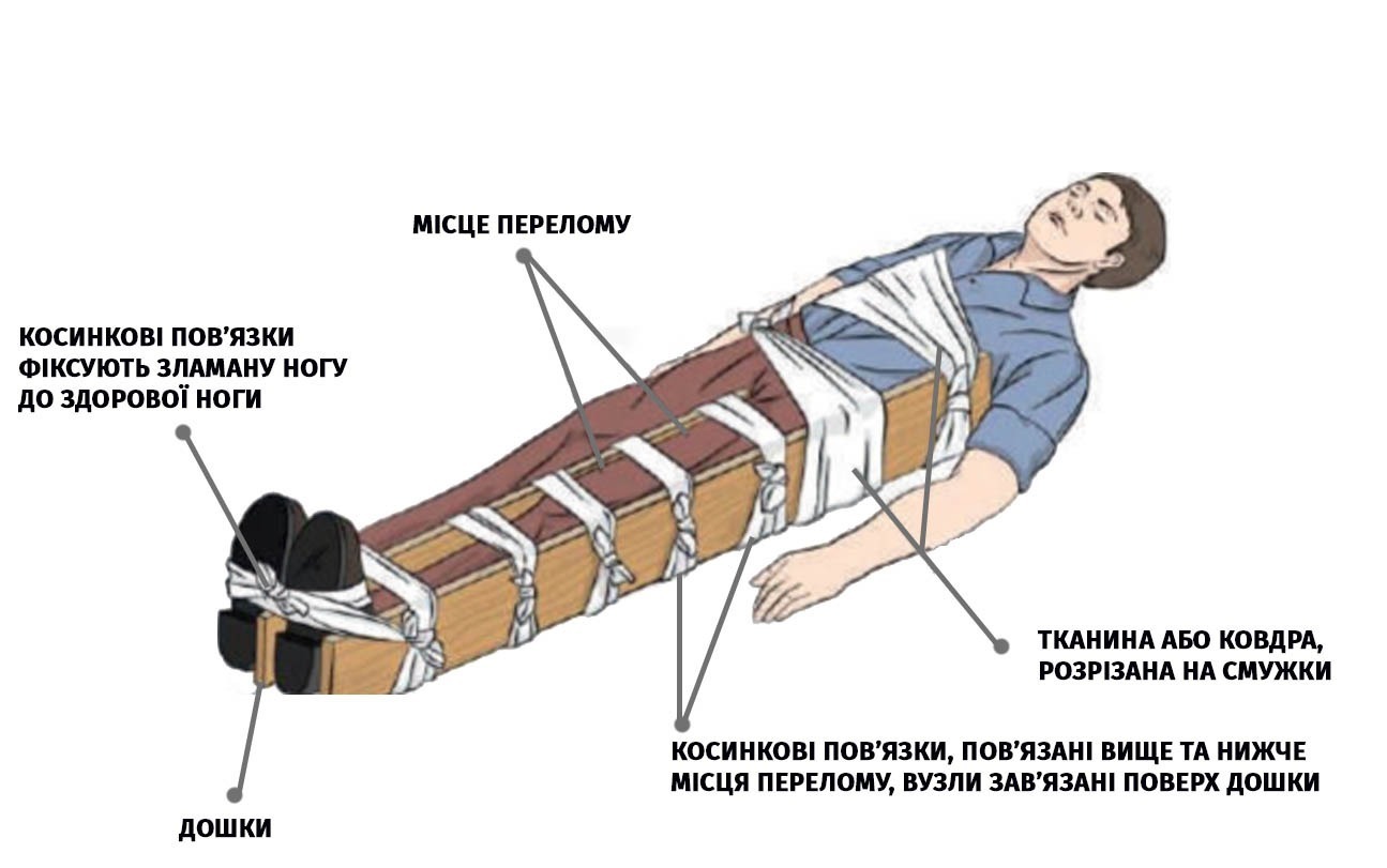Іммобілізація нижньої кінцівки при переломі стегна за допомогою підручних засобів.