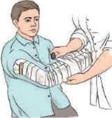 якщо можливо, надягніть на постраждалого іммобілізуючий бандаж (шматок тканини, обв’язаної кругом передпліччя та грудей постраждалого), для того, щоб зробити передпліччя нерухомим. Якщо зламано передпліччя, накладіть один іммобілізуючий бандаж поверх місця перелому і один нижче місця перелому.
