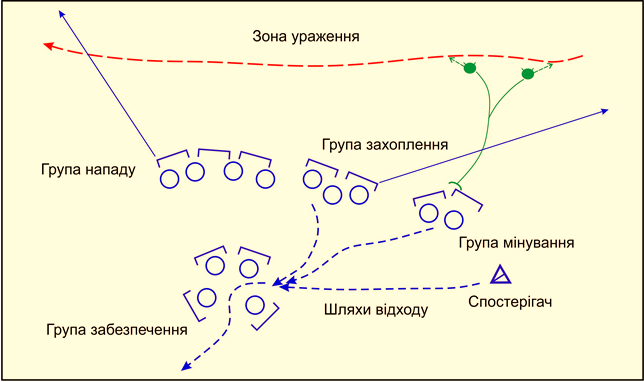 група (підгрупа) нападу (вогнева) – для знищення противника вогнем із стрілецької зброї, гранатометів і ручними гранатами;