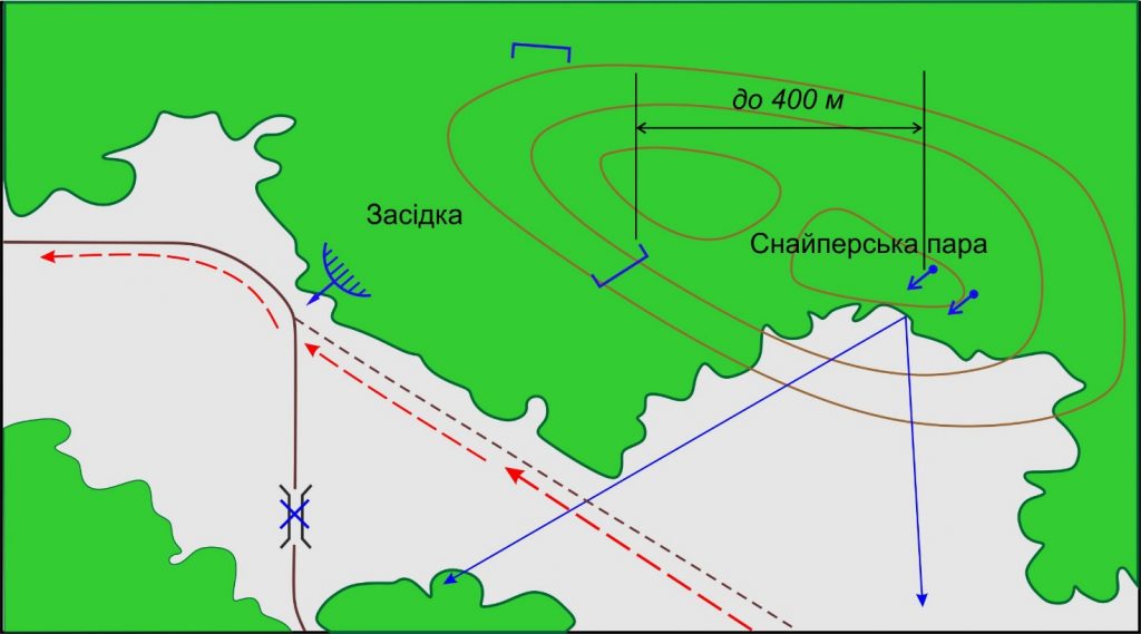 Оцінивши обстановку, що склалась, командир відділення приймає рішення влаштувати засідку наприкінці просіки силами відділення, а дозорних залишити на місці для спостереження за діями противника.