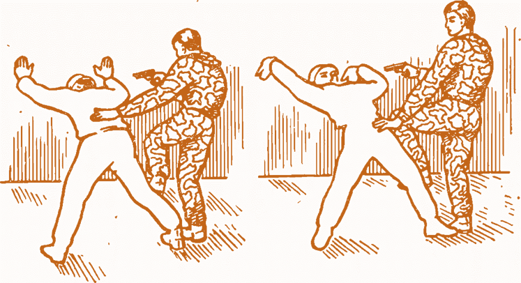 У першому випадку потрібно, підібравшись до противника ззаду, завдати сильного удару автоматом або іншим важким предметом по правому плечі; якщо противник тільки намагається брати зброю — бити по передпліччях рук, лівою рукою зажати йому рот і ніс, та закидаючи йому голову назад, своєю правою стопою штовхнути його в підколінний згин (краще лівої ноги, а не правої). В це же час обхопити горло противника правою рукою так, щоб лікоть опинився під підборіддям і провести удушення ліктьовим згином. Для посилення прийому треба свою ліву руку накласти на зап’ястя правої руки, а противника звалити собі на спину або посадити на землю. Коли він знепритомніє , на що потрібно не більш 15 секунд, разом зі своїм напарником віднести його в укриття.