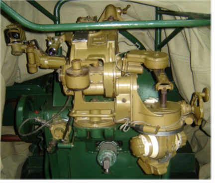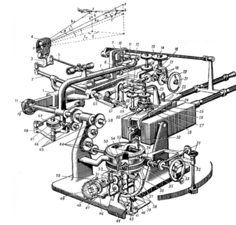 9 — важіль; 10 — ексцентрик; 11 — зубчастий сектор; 12, 13, 14,43, 51, 56 — шестерні; 16, 17, 18, 31 — конічні шестерні; 20 — шкала дальності; 21 — індекс;22 — візирна лінійка; 23 — зубчастий сектор; 24 — напрямна з кришкою; 25, 26, 28,59 — циліндричні шестерні; 27 — щуп; 30 — шток; 32 — валик; 33 — маховик з рукояткою;34 — черв’як; 35 — спіральне колесо; 36 — каретка; 37 — рейка; 38 — зубчастий сектор; 39 – мала шестерня; 40 — двоплечевий важіль; 41 — зубчастий сектор; 44 — важіль з пальцями; 46 — храповик;47 — ліва і права шкали;48 — лівий і правий маховики; 49 — клапан; 50 — сектор; 52 — конус; 53 — сектор; 54 — палець; 55 — кришка зі шторкою; 58 — вісь; 60 — подвійна шестерня; 61 — рейка;63 — циліндрична шестерня; 64 — механічне складання шестерень; 65 — подвійна шестерня;66 — черв’ячний валик; 67 — черв’ячні колесо; 68 — важіль; 69 — тяга; 70 — напрямна; 71 – ексцентрик.